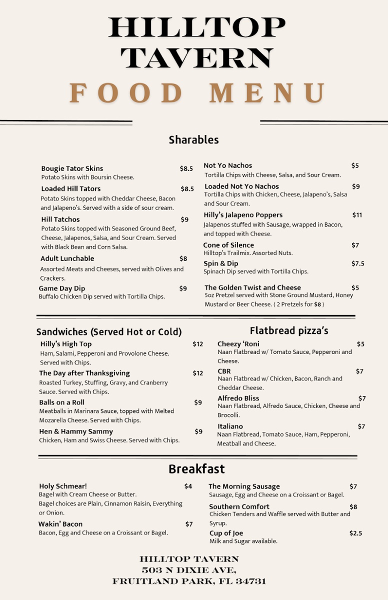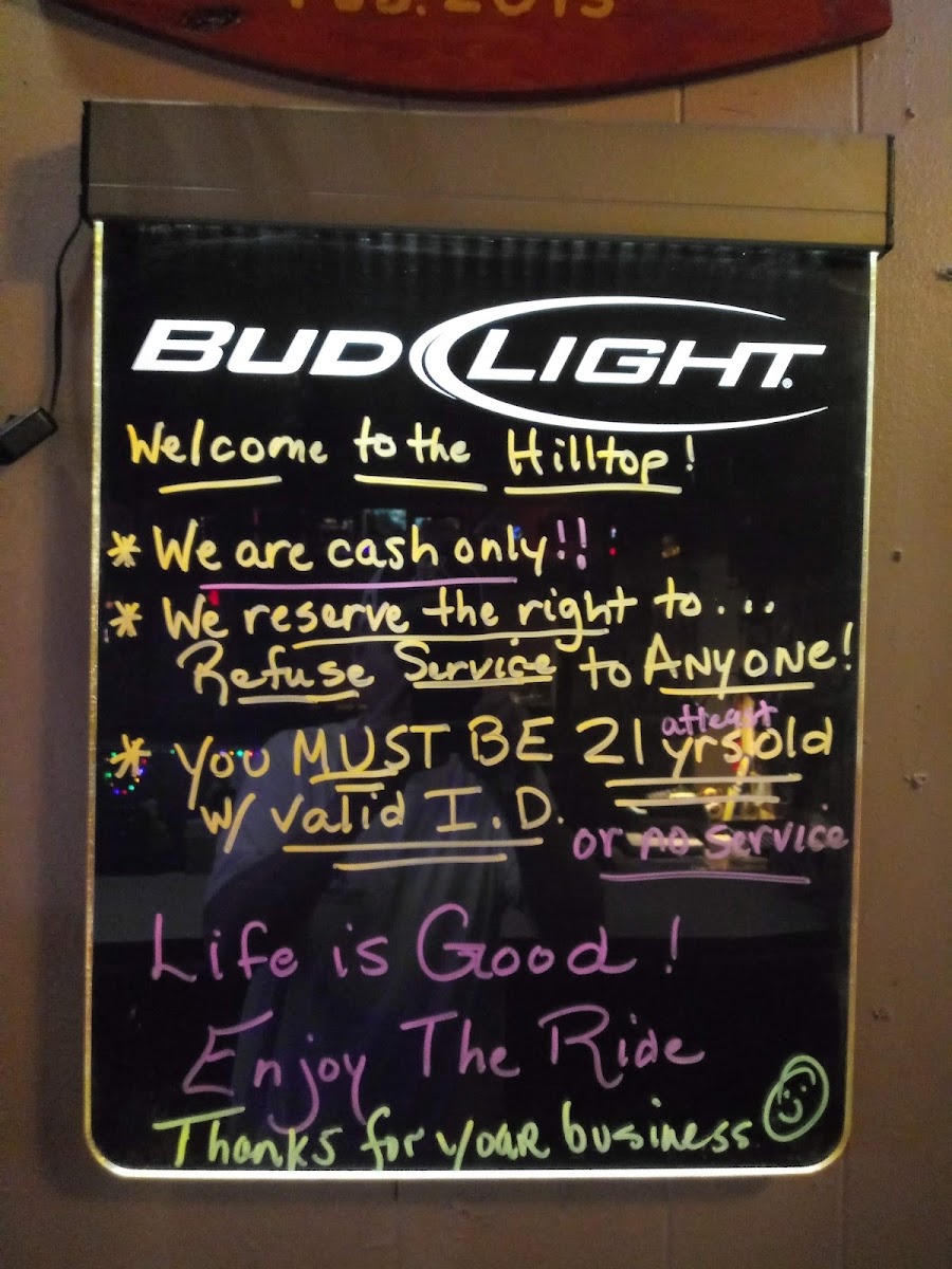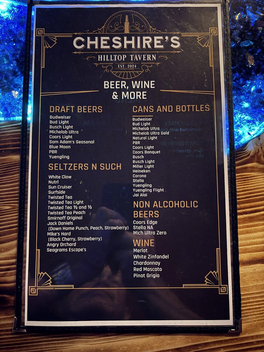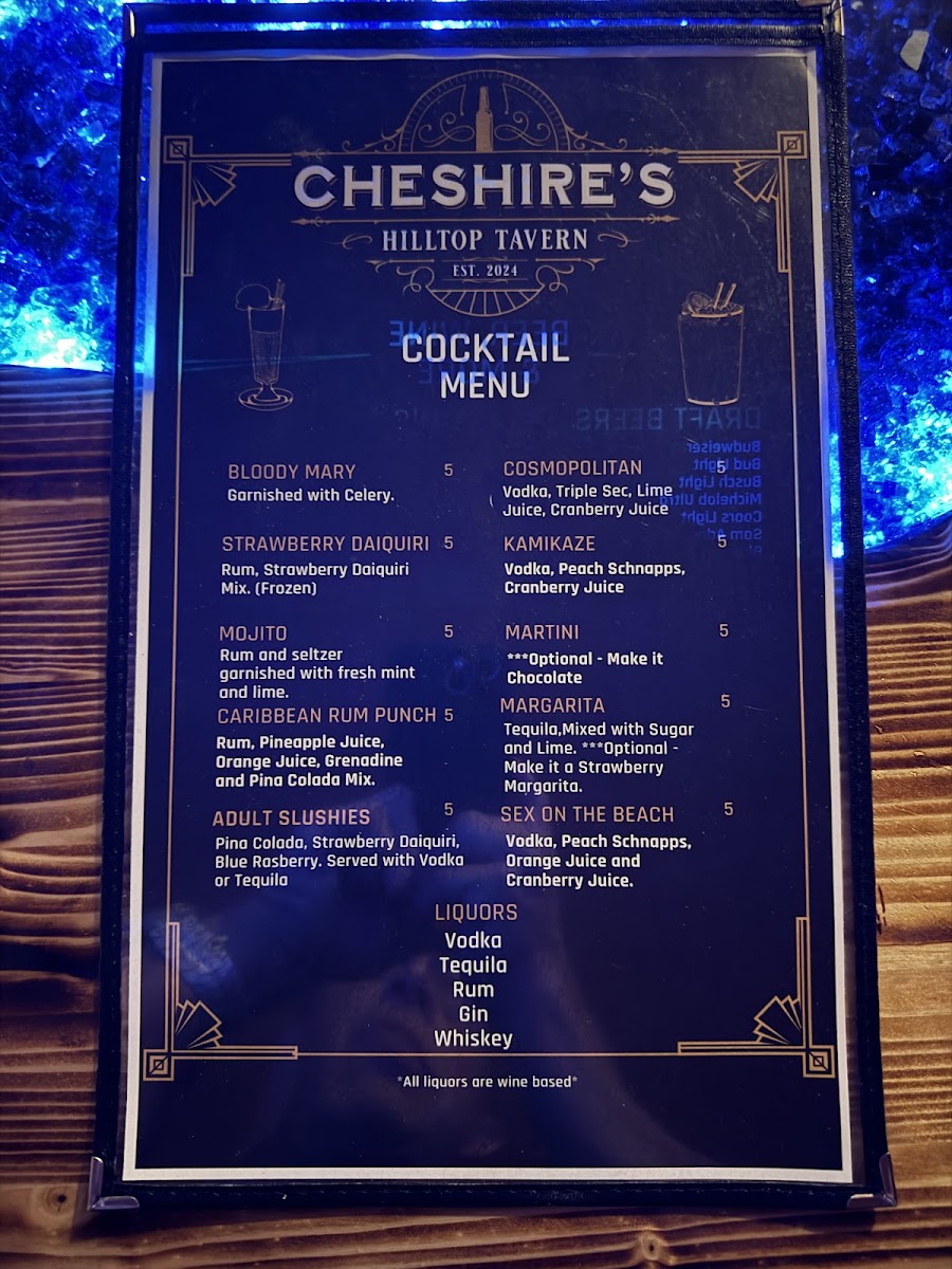 Cheshire's Hilltop Tavern Menu